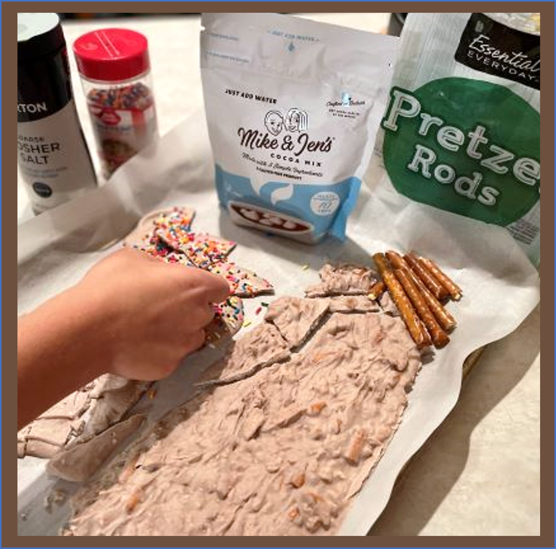 Hot Cocoa Bark- Melt 2 cups white chocolate chips in microwave. Heat at 30 seconds intervals until soft.